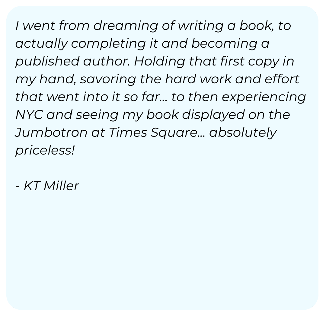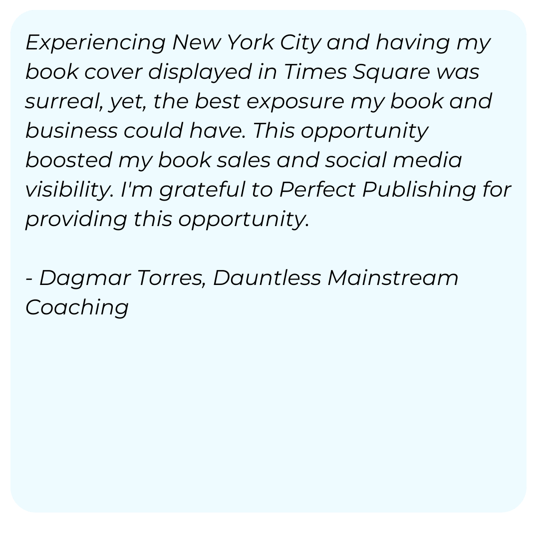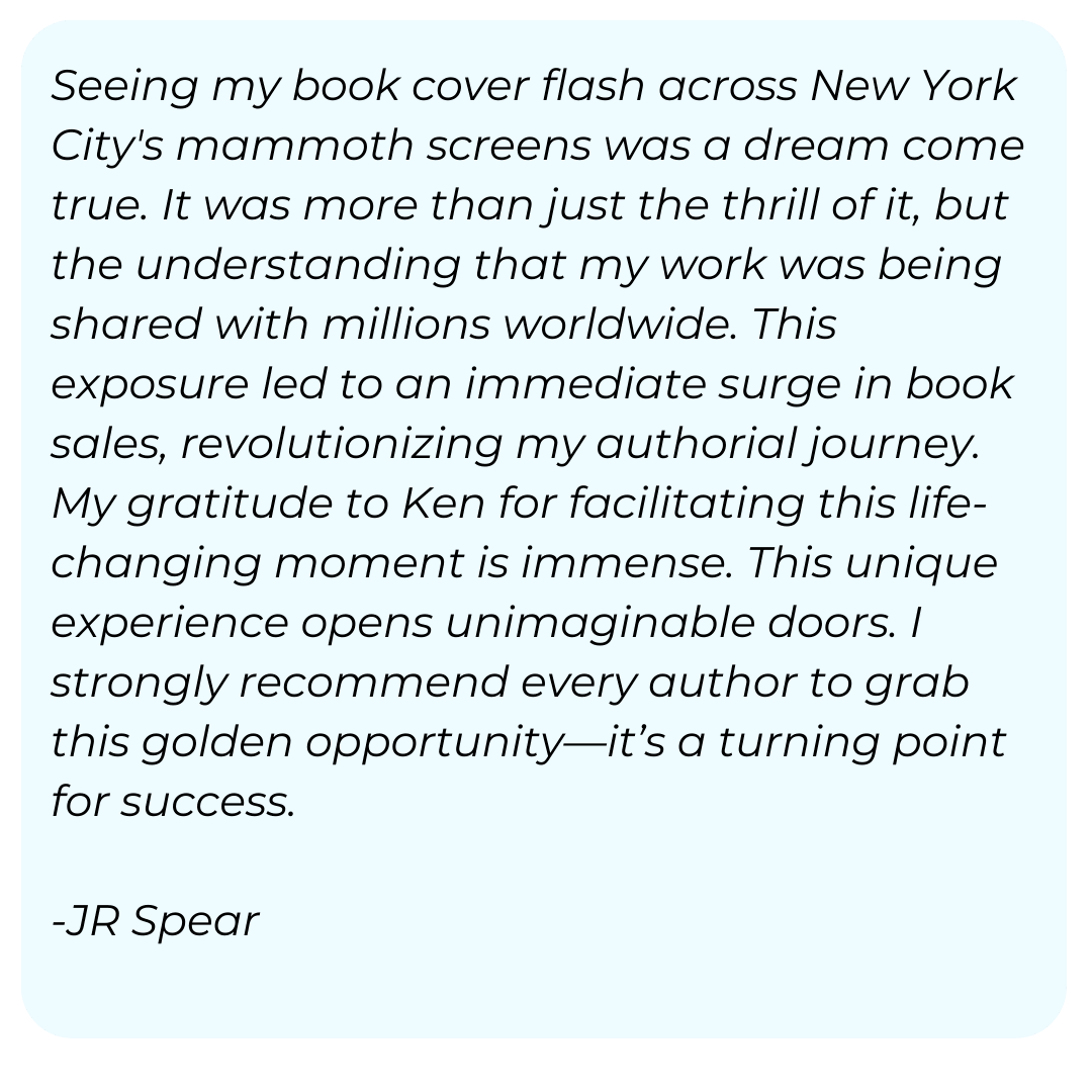 • Up to 3 days of book cover with purchase QR code on up to three Times Square billboards. (1-24 hours depending on board).